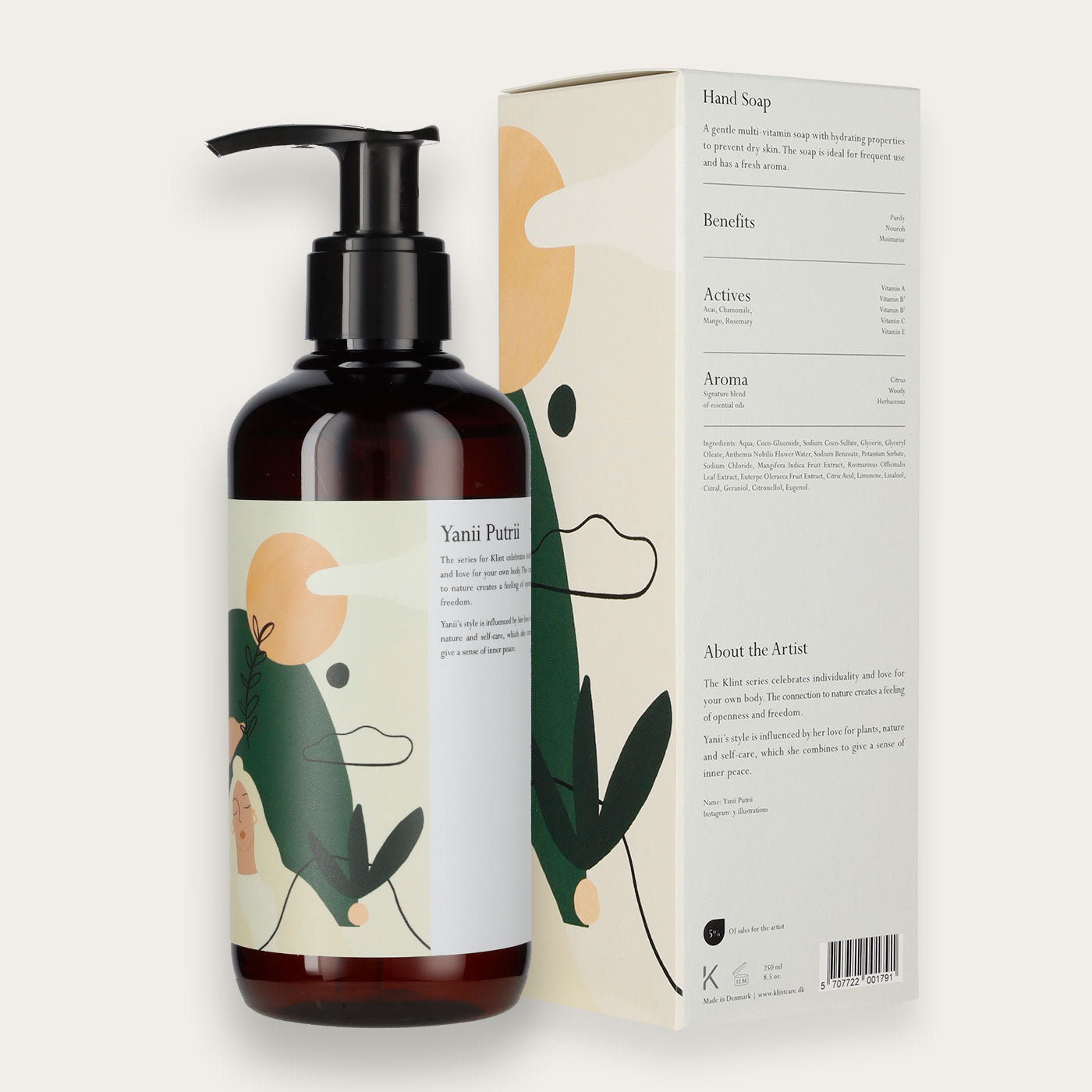 Yanii er designer og illustrator fra Karlsruhe, Tyskland. Hendes stil er præget af hendes kærlighed til planter, natur og selvpleje, som hun kombinerer for at give en følelse af indre ro. Klint x Yanii Putrii samarbejde hylder individualitet og kærlighed til din egen krop. Forbindelsen til naturen skaber en følelse af åbenhed og frihed. Vi har kaldt denne serie for 'naturføler'. Illustrationerne og aromaen fra denne serie af produkter vil bringe dig tilbage til naturen og give dig en ægte spa-følelse.