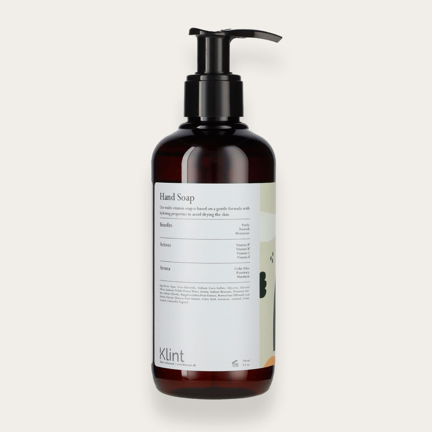 Håndsæben er 100% vegansk og fri for silikoner, syntetiske kemikalier (phthalater), petroleumsbaserede ingredienser (PEG'er), parabener og kunstige farver.